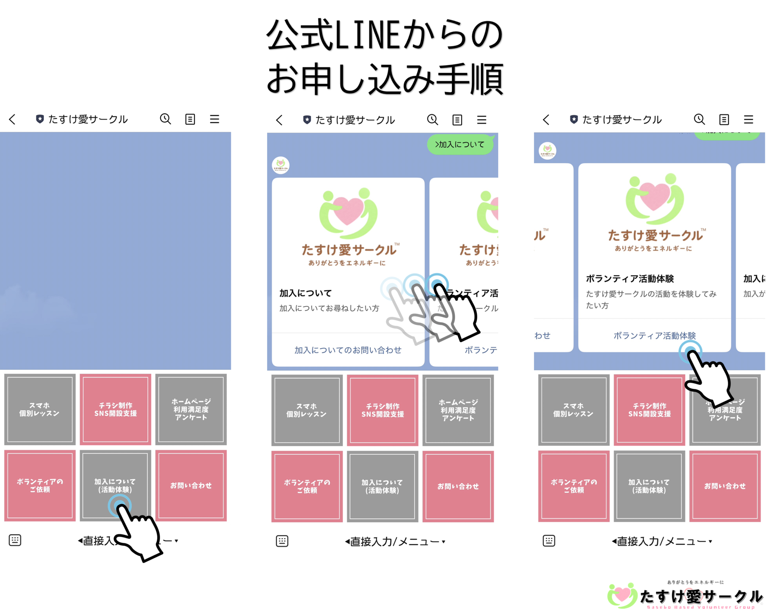 たすけ愛サークル公式LINE友だち追加後、専用フォームからお申し込みをお願いします。★お申し込みは、たすけ愛サークル公式LINEからのみ行うことができます