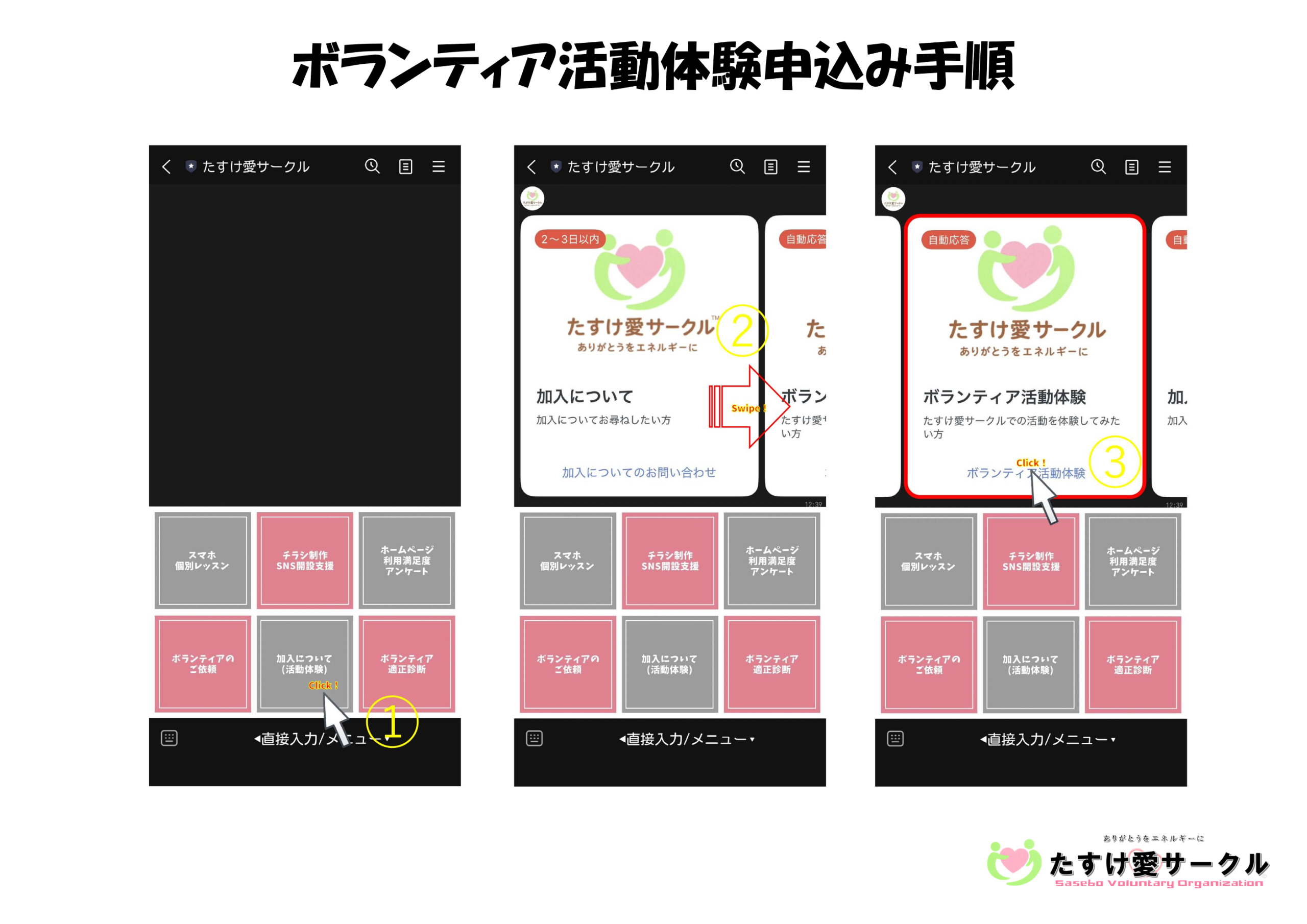 ★お申し込みは、たすけ愛サークル公式LINEから行うことができます。最下部の「活動を体験する」を押下して友だち追加をお願いします